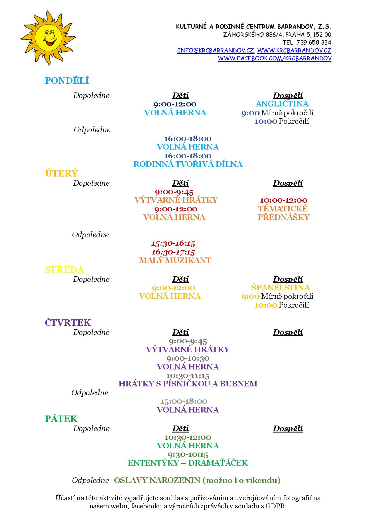 Zde je aktualizovaný program našeho provozu. Rádi bychom vás také požádali, abyste si nosili přezuvky. Máme zatím všude jen lino.
