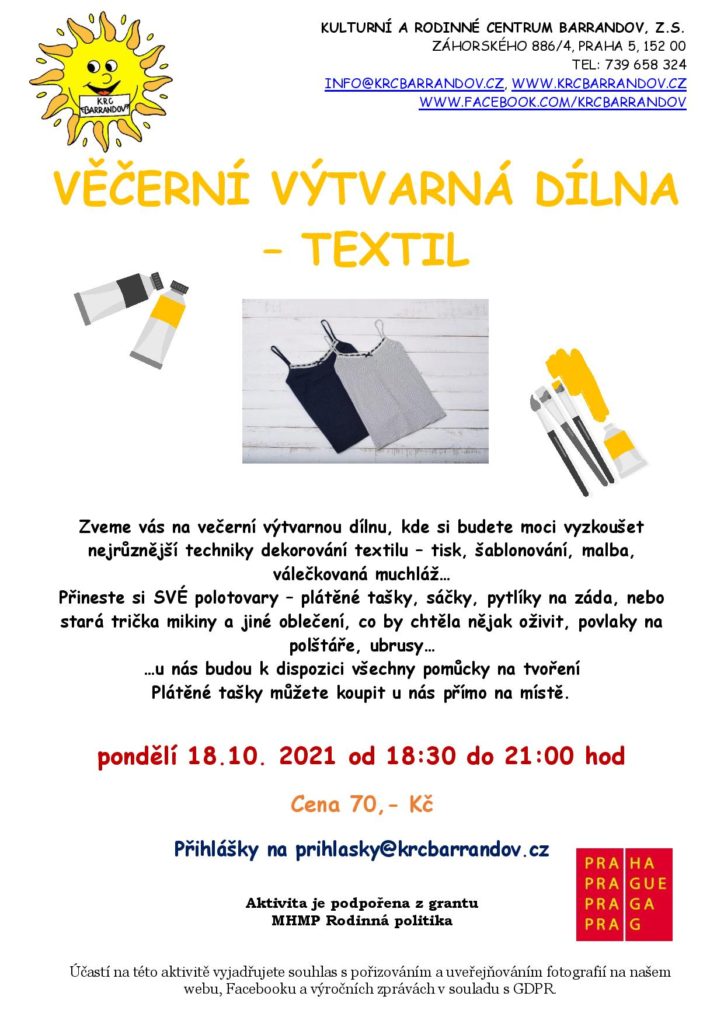 Zveme vás na večerní výtvarnou dílnu, kde si budete moci vyzkoušet nejrůznější techniky dekorování textilu – tisk, šablonování, malba, válečkovaná muchláž…