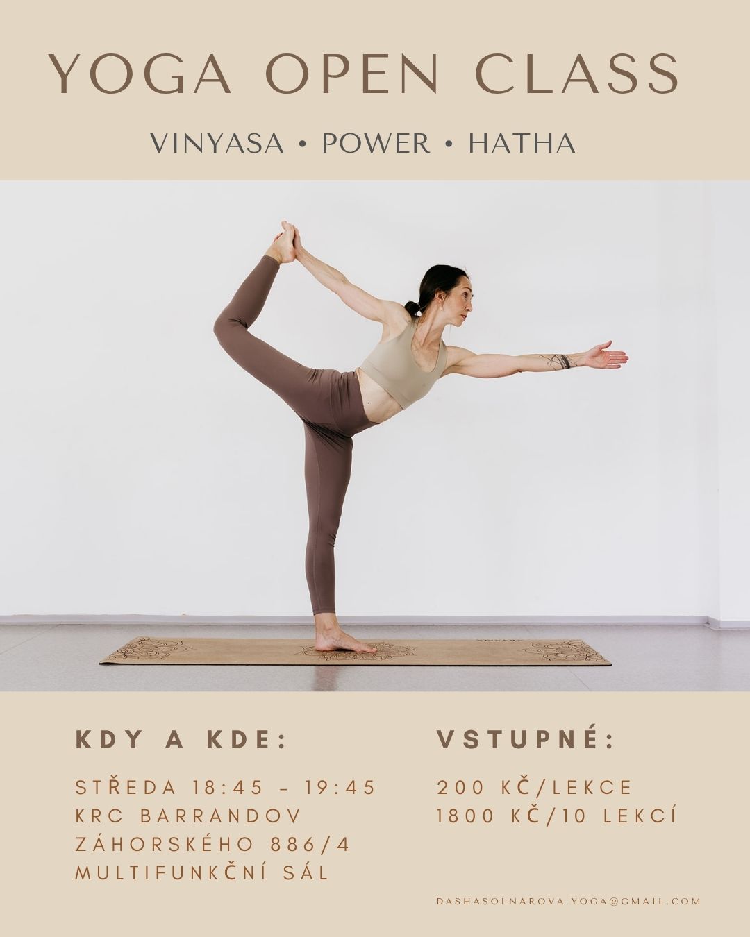 Autor: Kristýna Ouborná20. 11. 202520. 11. 2025 VINYASA • POWER • HATHA KDY A KDE: STŘEDA 18:45 – 19:45 KRC BARRANDOV ZÁHORSKÉHO 886/4, MULTIFUNKČNÍ SÁLVSTUPNÉ: 200 KČ/LEKCE 1800 KČ/10 LEKCÍDASHASOLNAROVA.YOGA@GMAIL.COM