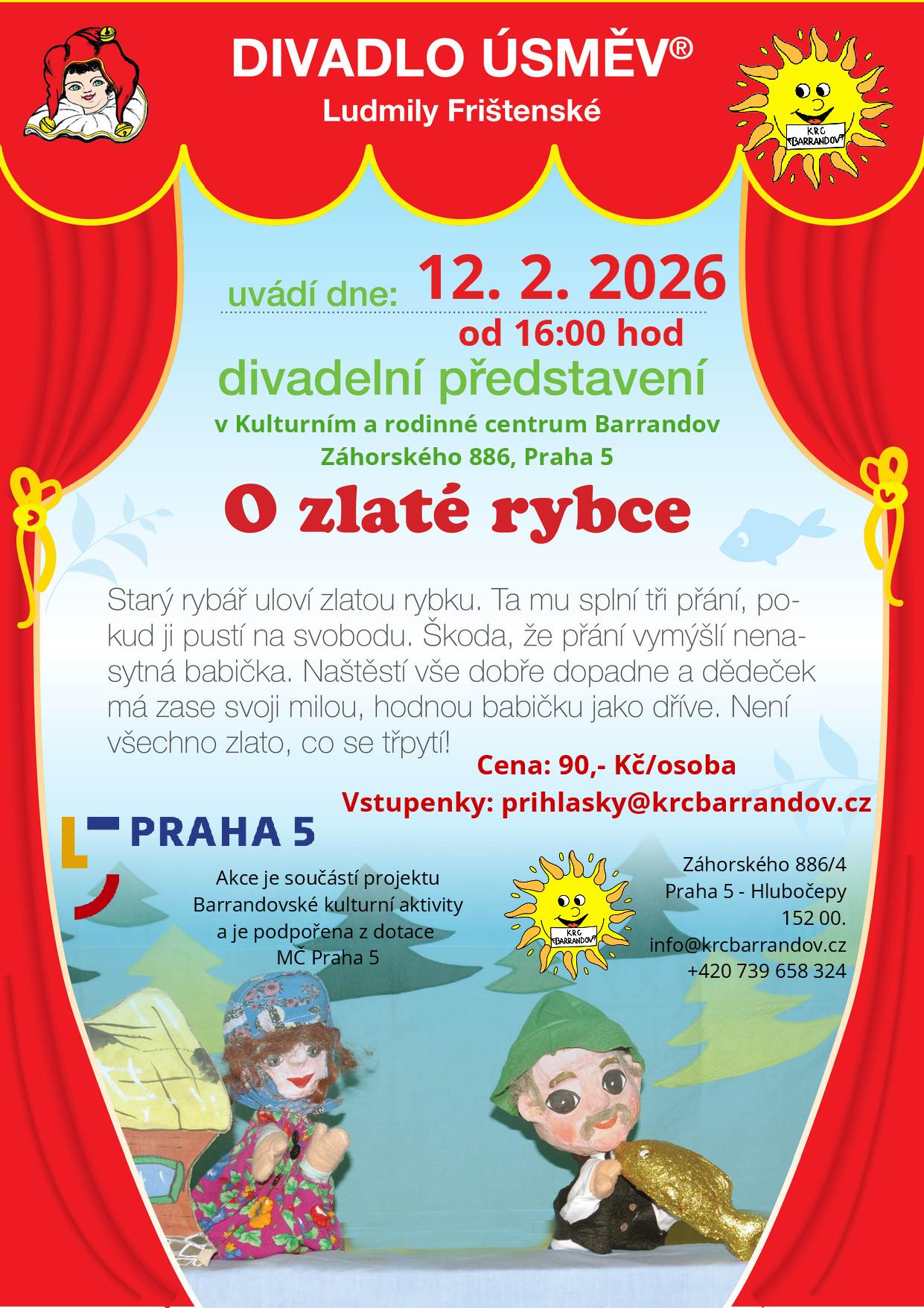 Autor: Kristýna Ouborná22. 1. 20266. 2. 2026 DIVADLO ÚSMĚV Ludmily Frištenské uvádí dne 12.12.2026 od 16:00 hod divadelní představení v Kulturním a rodinném centru Barrandov Cena: 90,- Kč/osoba Vstupenky: prihlasky@krcbarrandov.cz